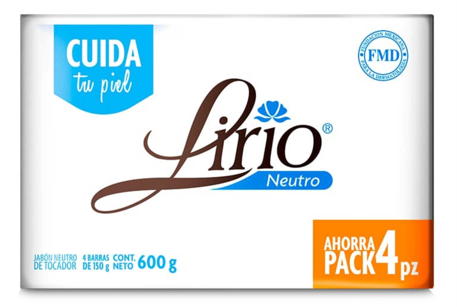 Pack jabón de tocador Lirio neutro Cuida tu piel, Ahorra Pack. Contiene 4 barras de 150 gramos cada una.