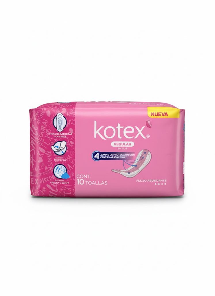 Kotex Regular, Toallas sin alas, Flujo abundante, 10 toallas cantidad