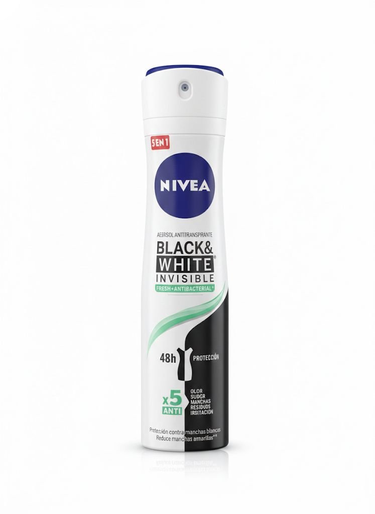 / Nivea 5en1 Aerosol Antitranspirante Black & White Invisible Fresh + Antibacterial 48h, 150 ml (asumiendo tamaño estándar de aerosol)