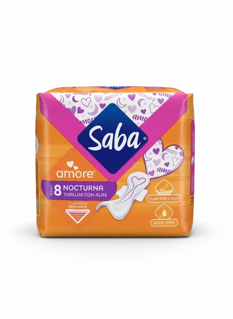 Saba Amore Nocturna, Toallas con Alas (Flujo Súper Abundante, Cubierta Suave, Aloe Vera), Cont. 8 cantidad