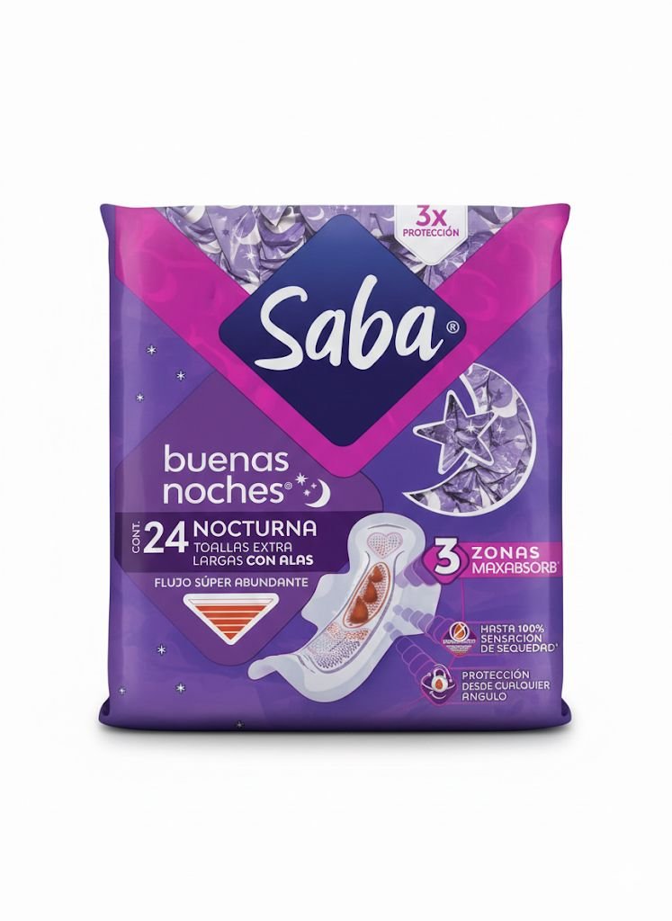 / Saba Buenas Noches Nocturna Toallas Extra Largas con Alas Flujo Súper Abundante Cont. 24 Toallas