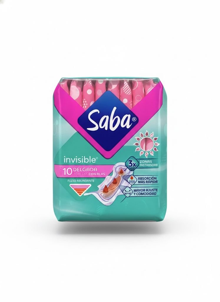 Saba Invisible, Delgada, Toallas con alas, Flujo abundante, 10 toallas cantidad